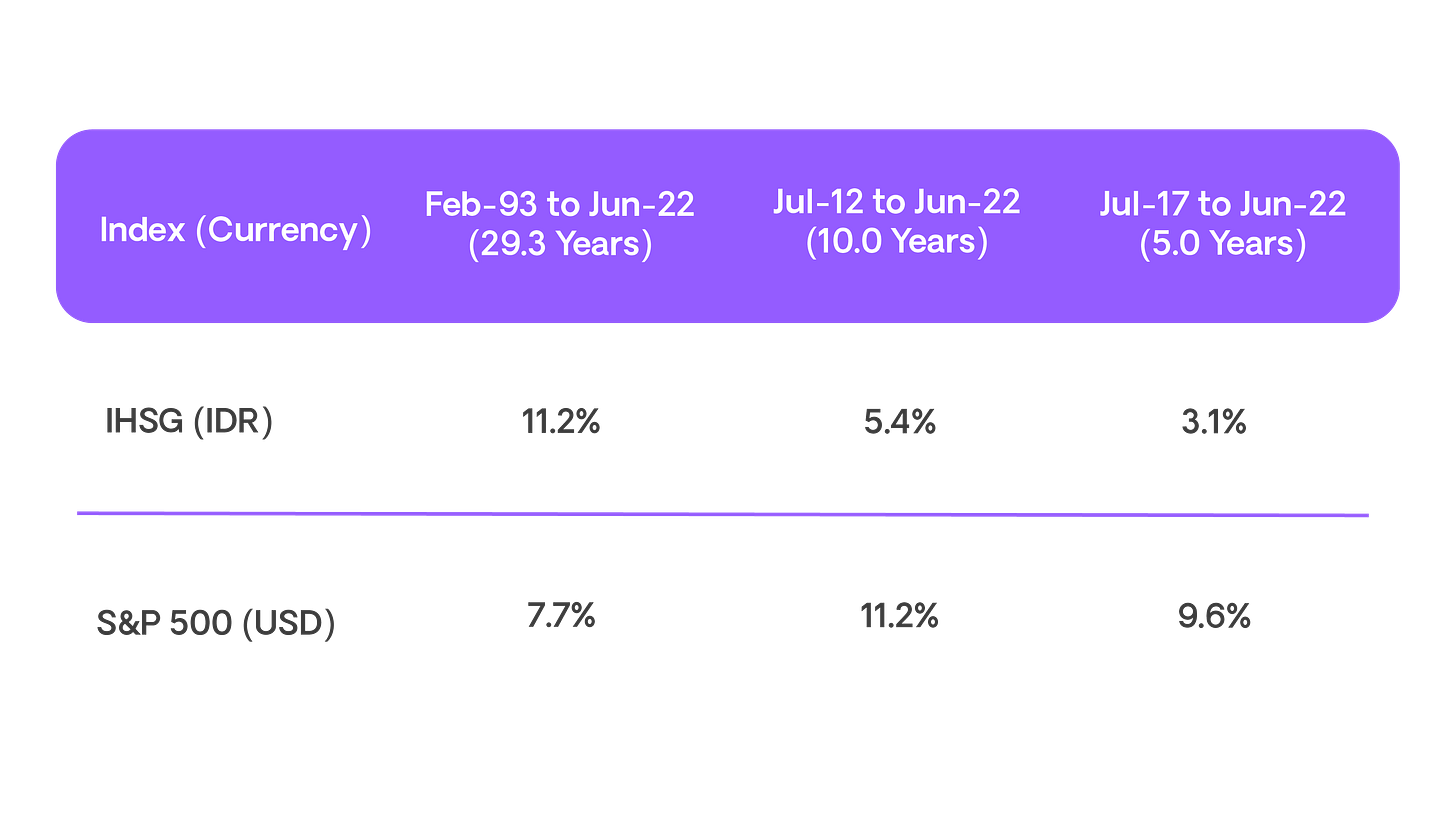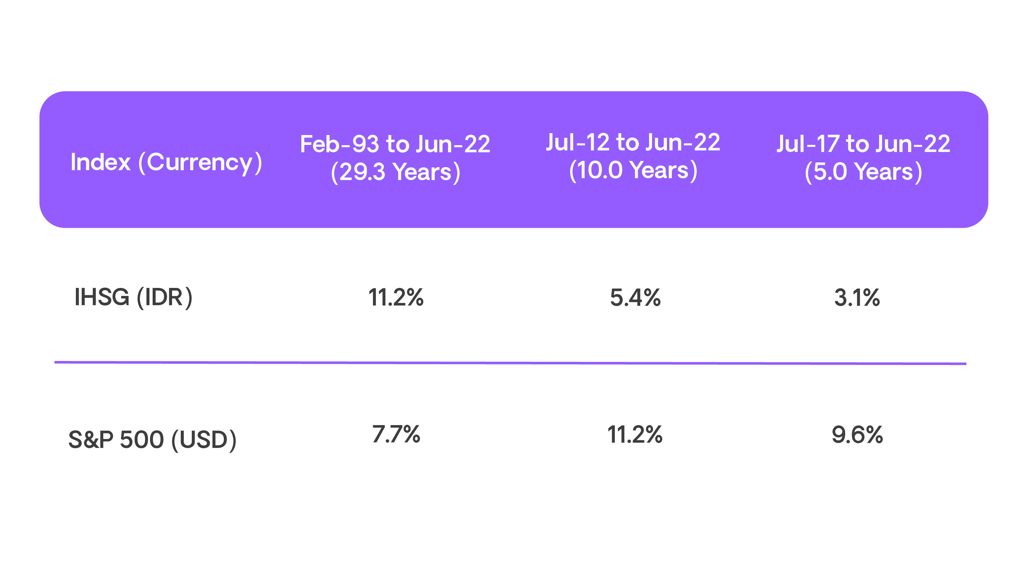 If you had invested money in February 1993 into the IHSG Index, and held on to the investment until the end of June 2022, you would have generated an average annualised return of 11.2%. That’s basically close to a 22x return within 29 years of holding the investment!