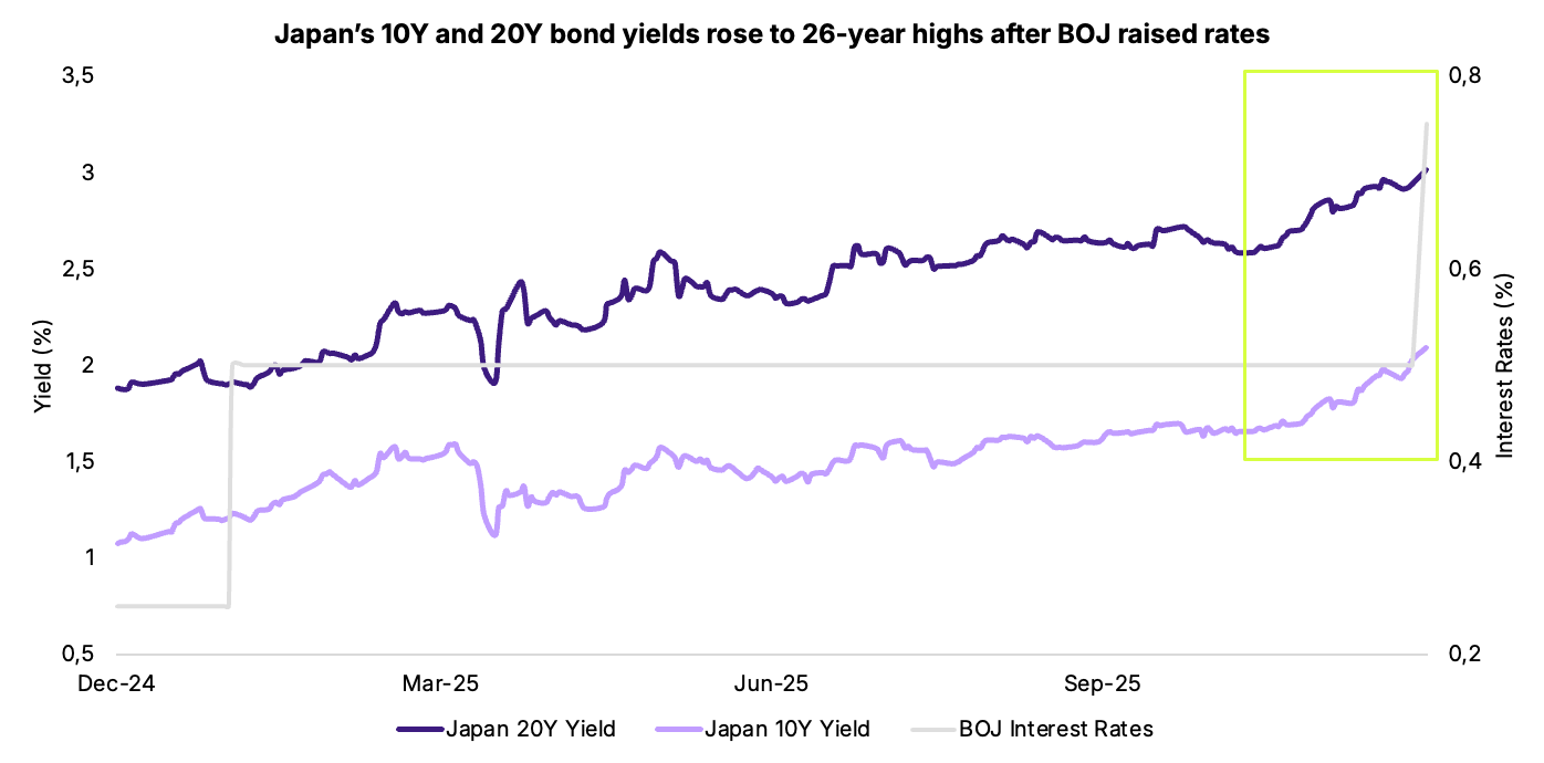 On Friday, the Bank of Japan (BOJ) raised its interest rate 0.75%, the highest level in 30 years, marking another step in its gradual policy normalization. Despite the hike, the BOJ emphasized that real interest rates remain significantly negative and that financial conditions will stay accommodative to support economic activity.