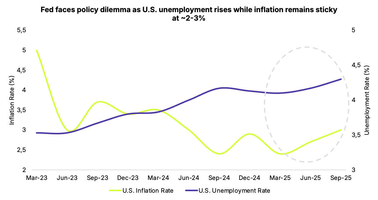 The Fed remains caught between rising unemployment (~4%) and sticky inflation (~2–3%), complicating the policy outlook.