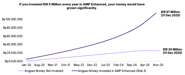 Assume I received IDR 5 million in angpao money each year for 5 years. If I had simply kept it untouched, it would total IDR 30 million at the end of the 5th year. But if it had been invested consistently in AMP Enhanced (Risk 3), a neutral risk profile with 5%–50% equity exposure, the outcome could have been significantly different.