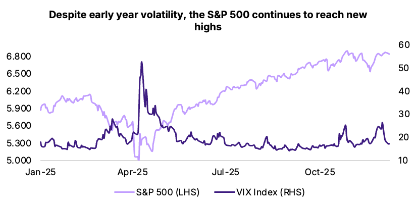 While these events initially unsettled markets, the sell-off turned out to be short-lived. Risk appetite soon recovered as uncertainty eased. By May, markets had stabilized, with U.S. indices rallying to new highs by year-end. Tech continued to dominate the narrative, given robust Q3 earnings and euphoria around AI-related names.