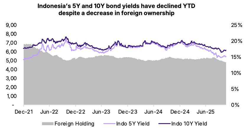 A similar theme played out in Indonesia’s bond market. Even as foreign ownership fell to decade lows, we noticed an interesting case where yields remained broadly stable and in some cases declined. When foreigners sold, domestic institutions stepped in to absorb supply and limit volatility.