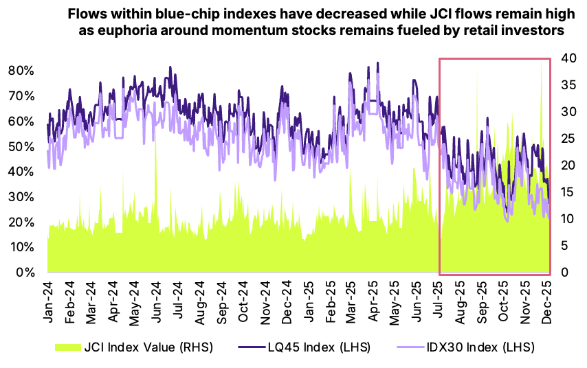 Indonesia experienced its own episode of political uncertainty following the social unrest and cabinet reshuffle announced in August. The new MoF and Indonesia’s new political environment under the Prabowo administration left foreign investors cautious (overall, they were net sellers in 2H’25). Flows to blue-chip stocks were muted. Despite this, the JCI reached record highs, driven by momentum stocks and strong participation from domestic investors.