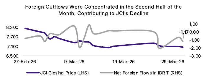 In addition to geopolitical tensions, Rupiah weakness, elevated oil prices, and MSCI-related uncertainty reinforced a risk-off environment. As a result, the JCI declined -14.2% MoM, with the blue-chip index IDX30 down around -12%.
