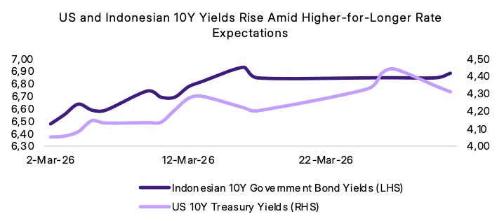 Elevated oil prices and inflation concerns drove a repricing of interest rate expectations, triggering a sell-off in the bond market both globally and domestically. As a result, US 10Y Treasury yields rose ~28 bps, while Indonesian 10Y Government Bond yields rose ~41 bps.