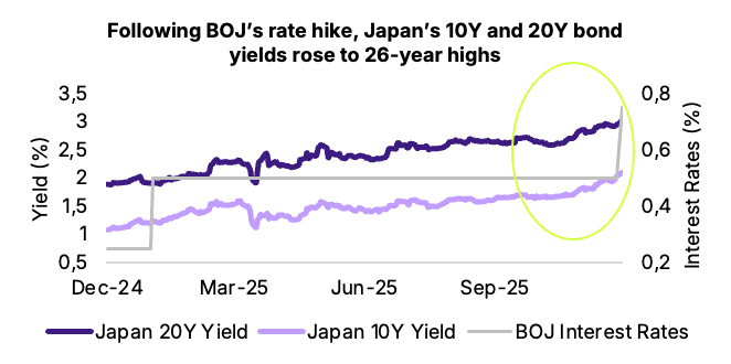 Bank of Japan (BOJ) raised rates to a 30-year high, marking a step towards policy normalization due to rising inflation. The decision triggered a sell-off in bonds, with yields reaching 26-year highs.