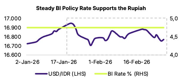 With the ongoing geopolitical tensions, we expect markets to remain volatile in the near-term. We also expect uncertainties surrounding MSCI policy changes to further weigh on investor sentiment. Furthermore, rising oil prices following the closure of the Strait of Hormuz pose inflationary risks for Indonesia, a net oil importer, which could widen the fiscal deficit and place additional pressure on the Rupiah.