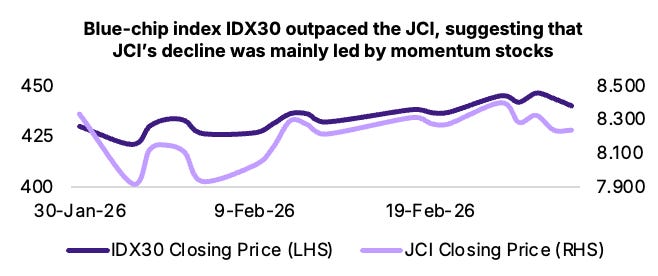 Despite broader market weakness, the blue-chip index IDX30 closed out higher by ~+2%, suggesting that weakness in the JCI was primarily driven by momentum stocks.