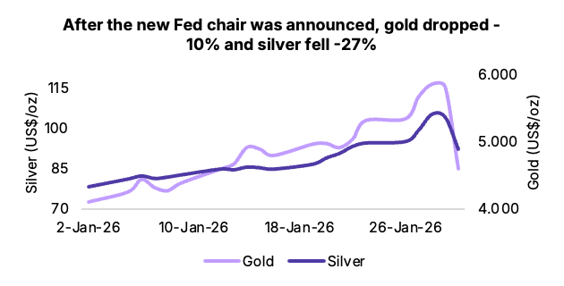 Amid geopolitical tensions, investors rushed to safe-haven assets, pushing gold & silver to all-time highs. However, prices dropped sharply after the announcement of Kevin Warsh as the new Fed Chair boosted the US Dollar.