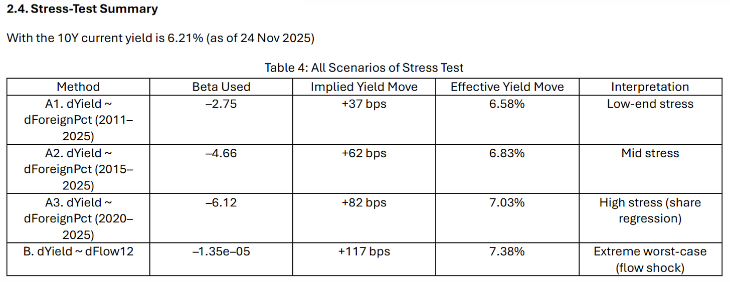 The tables below outline the various stress-test scenarios—showing how far yields could move under foreign selling—and the yield levels at which domestic institutions typically step in to buy.