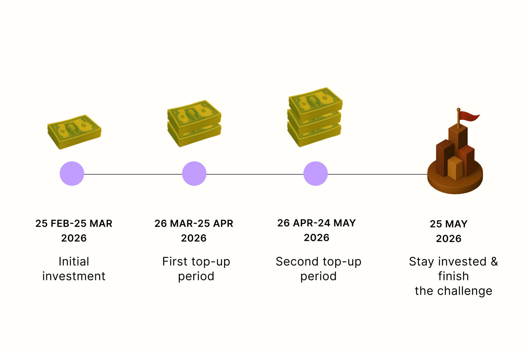 2. Grow your investment. You must perform at least one manual top-up in the top-up window(s) defined below*. These contributions should bring your total net deposit to Rp 15,000,000 by the end of the challenge.