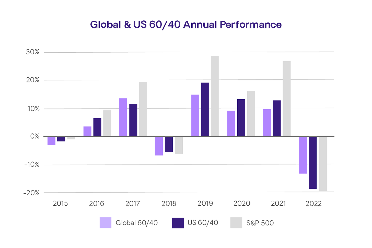 Source: Bloomberg. As of Jan 2023. For illustrative purposes only. Assumes passive management and no rebalancing. Global 60/40 constituents: MSCI All Country World Index and Bloomberg Barclays Global Aggregate Index. US 60/40 constituents: Vanguard Total Stock Market ETF and Vanguard Total Bond Market ETF.