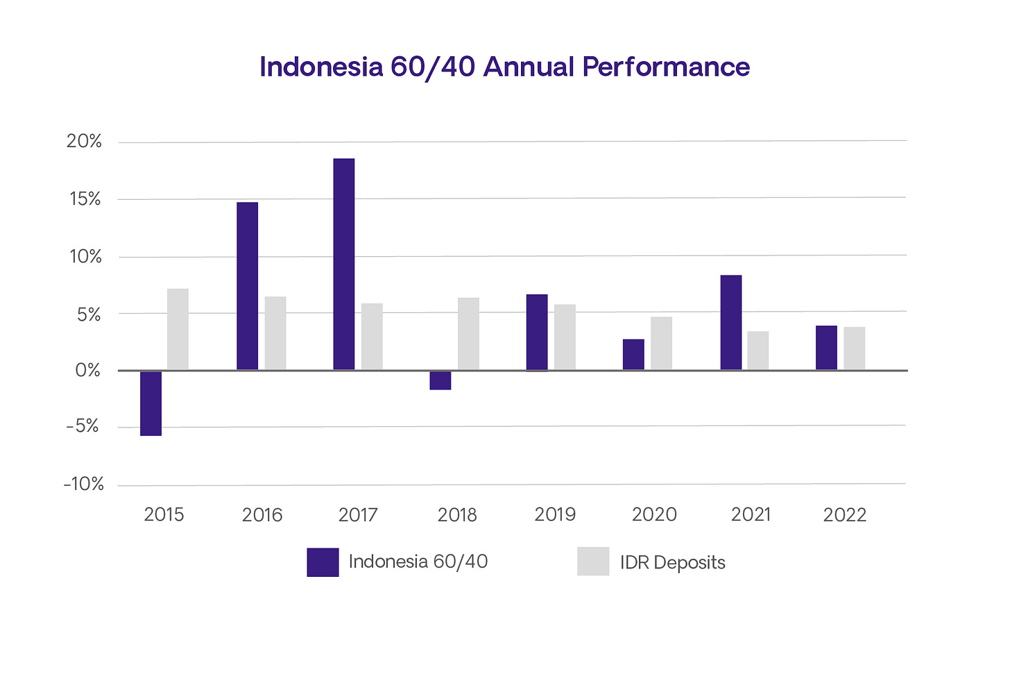 Source: Bloomberg. As of Jan 2023. For illustrative purposes only. Assumes passive management and no rebalancing. Indo 60/40 constituents: Jakarta Composite Index and Indonesia Bond Pricing Agency Composite Index. IDR Deposits: Average 3 Month Time Deposits.
