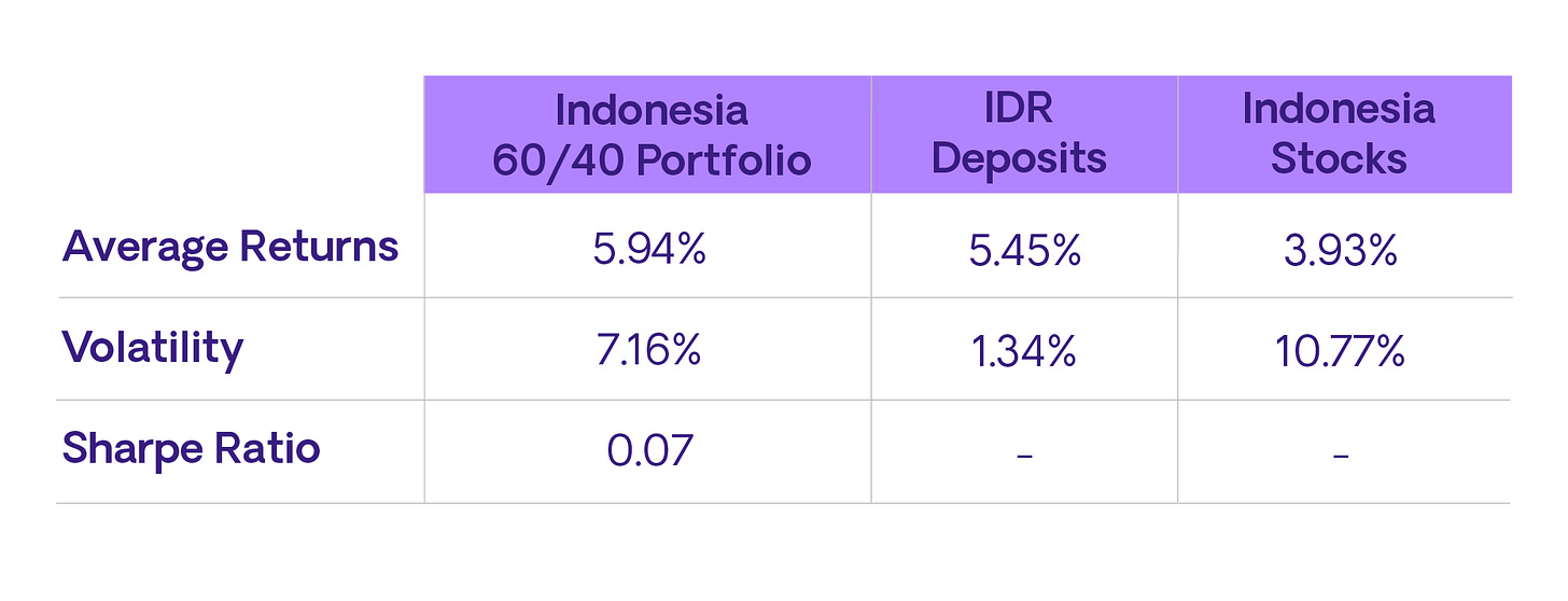 However, when we compare these returns against Indonesian Bank Deposits, the performance of the 60/40 portfolio looks less compelling. Over the same timespan, Bank Deposits averaged ~5.5% in returns every year - or 0.5% less than the 60/40 portfolio.