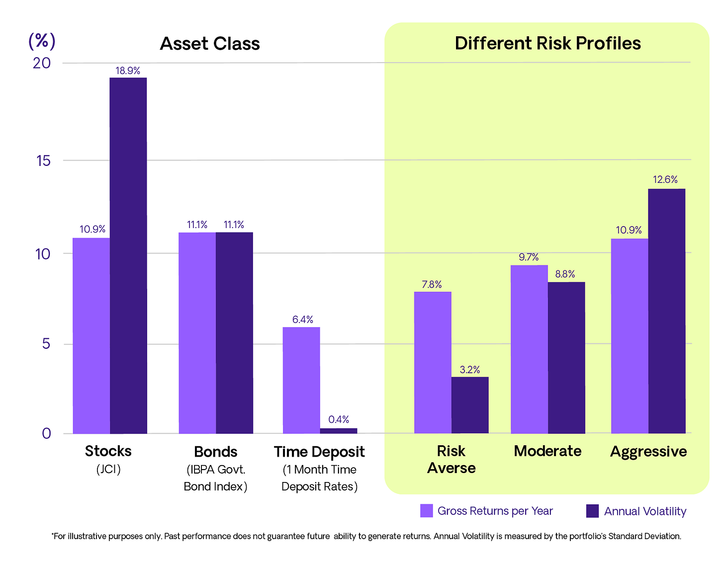 We then back-tested how the portfolios performed over the same time period. For the Risk Averse Portfolio, we could generate slightly higher returns but with slightly higher volatility due to the mix of bonds and equity. On the other hand, an Aggressive Portfolio can generate similar returns to the JCI but with less volatility. In practice, we would conduct tactical asset allocation within each fund and select specific stocks and bonds to outperform the benchmark.