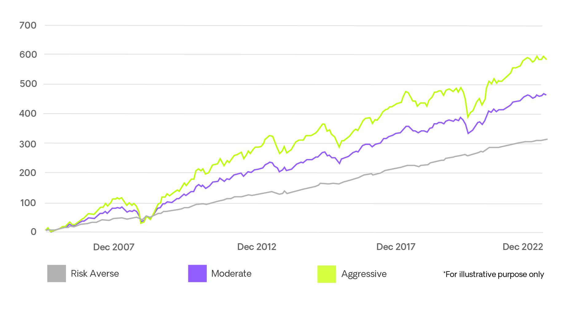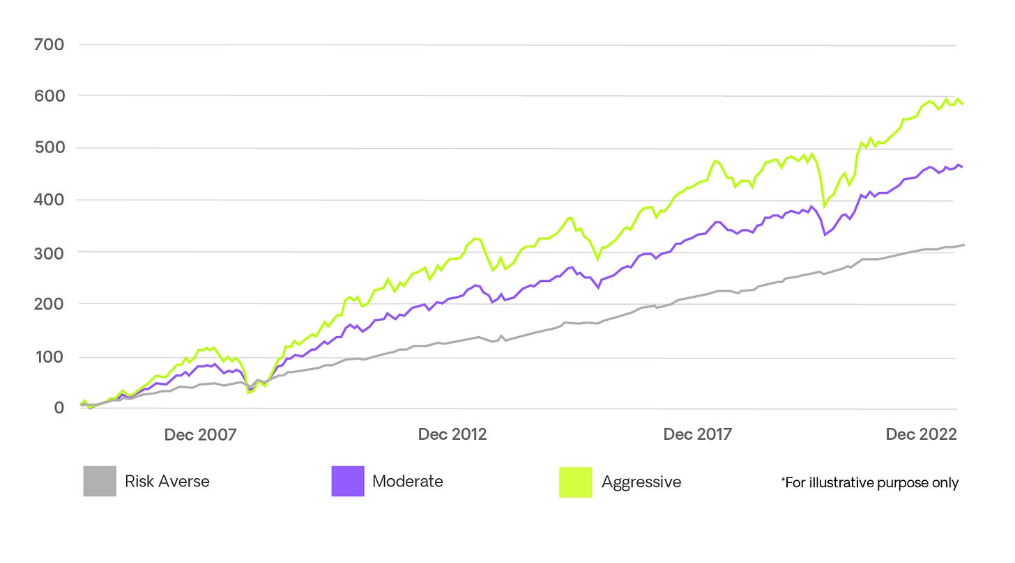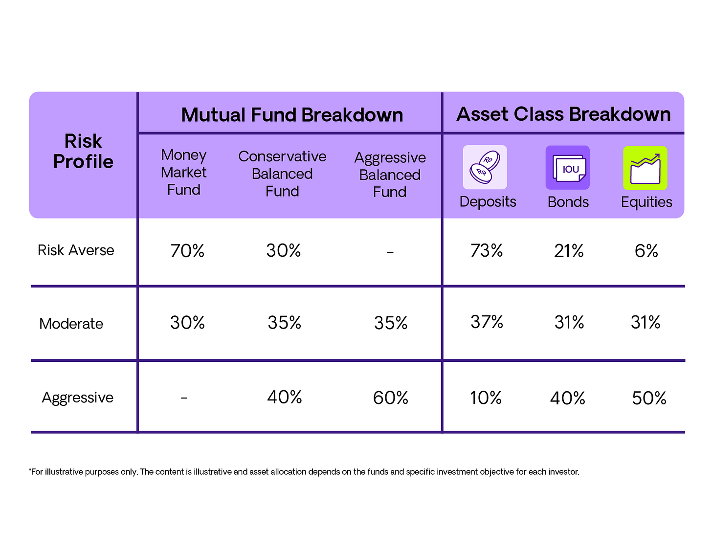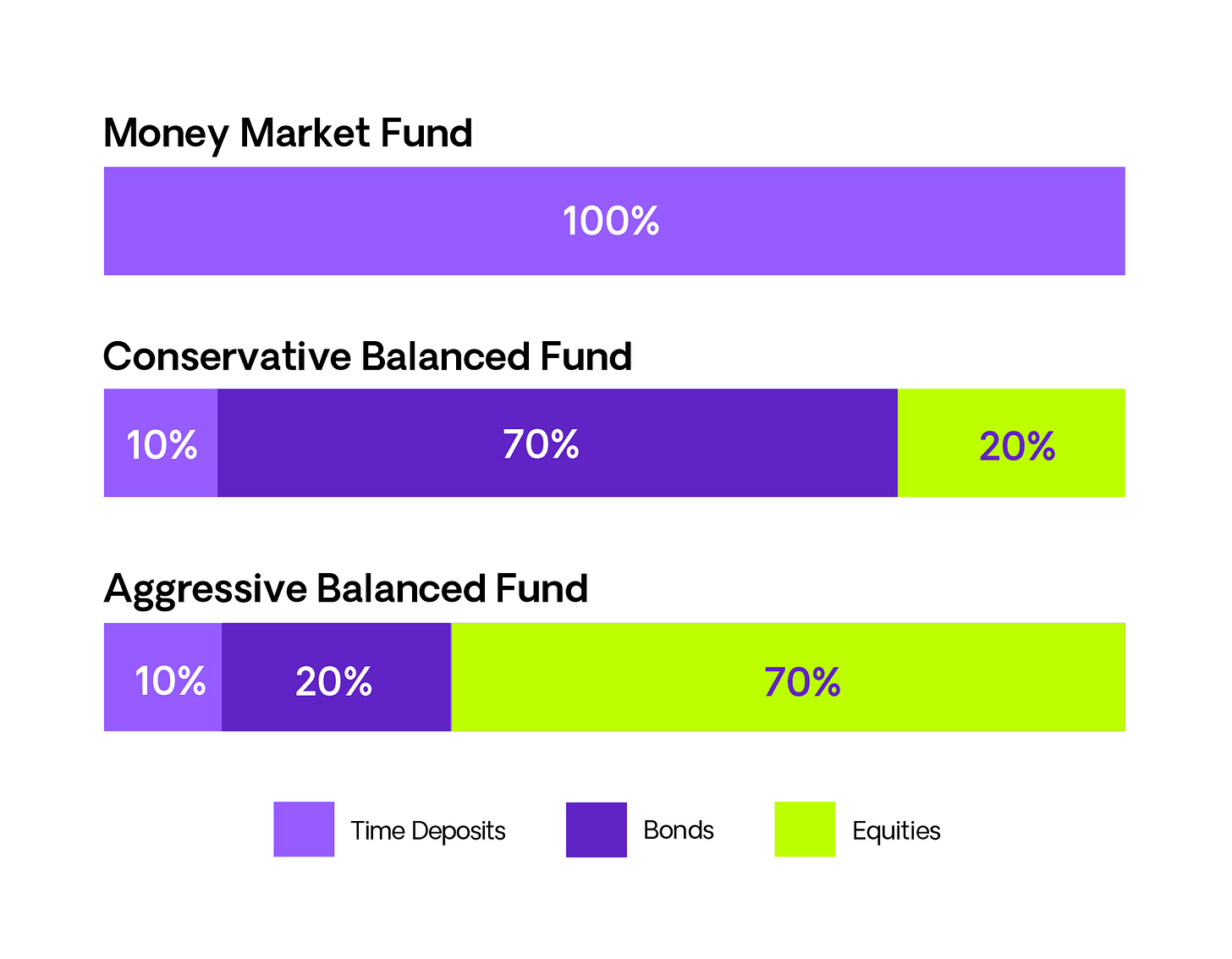 Assume we have three different mutual fund strategies or reksa dana shown below. Our two Balanced Funds differ between Fixed Income and Equity, with the Conservative Balanced Fund more towards Fixed Income (70%) and the Aggressive Balanced Fund more towards Equity (70%). More on this below.