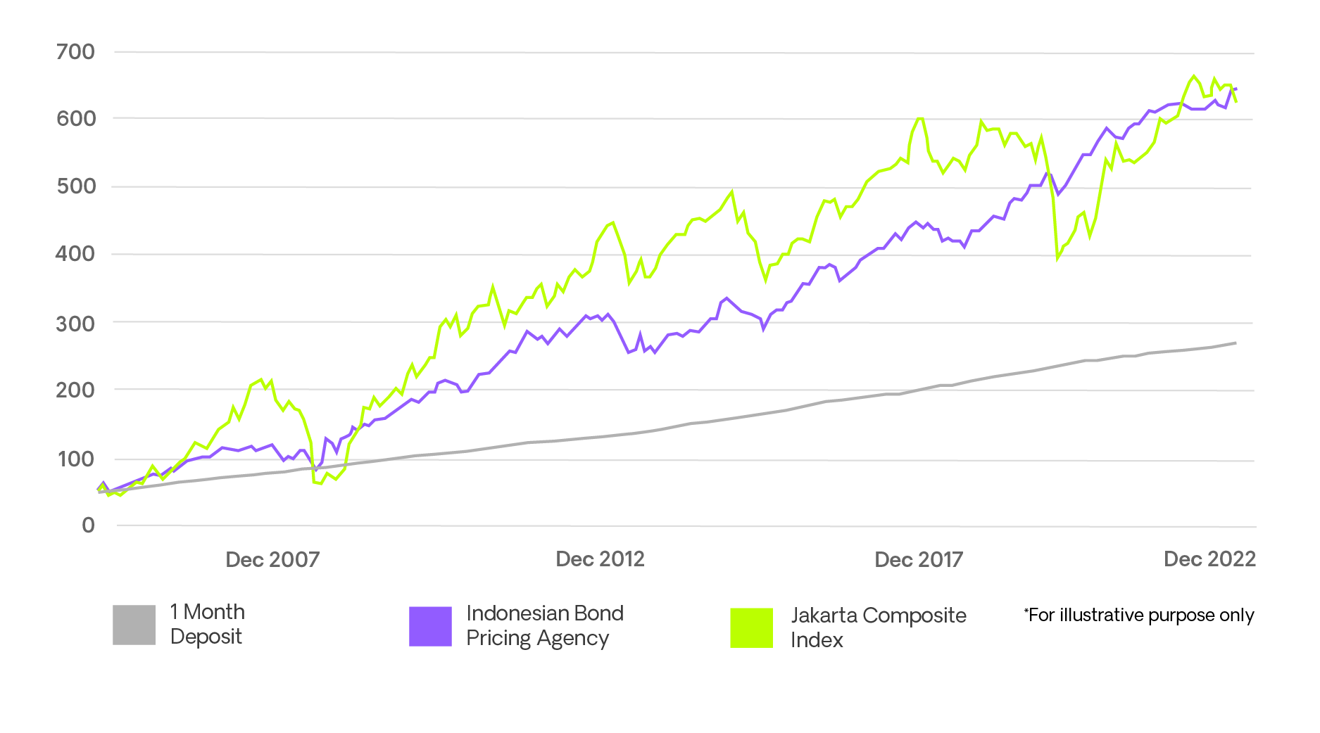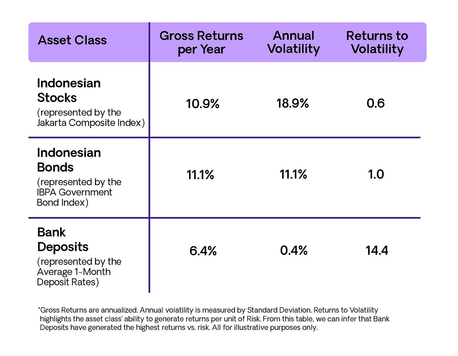 In order to showcase our findings, let's observe the risk and return characteristics of individual asset classes in the Indonesian capital market.