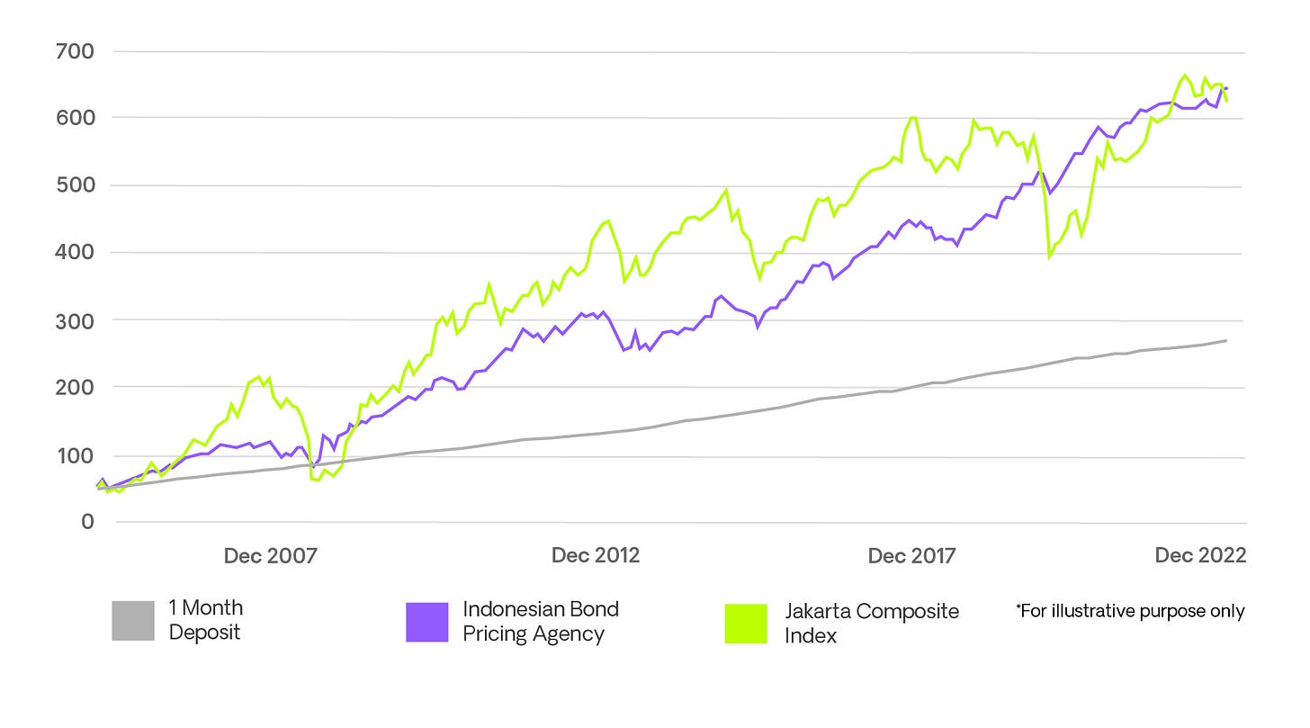 Indonesian Stocks and Bonds offer similar returns at 10.8% and 10.2% gross returns per year, respectively; Although surprisingly, Indonesian Bonds over the long-term has performed slightly better than Indonesian Stocks;