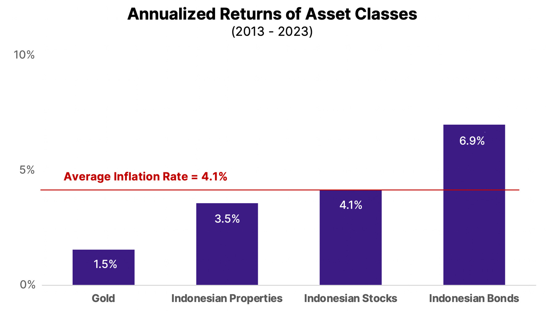 As a retail investor, what options do I have? There are various types of asset classes and instruments available for retail investors in Indonesia. To list a few, investors can directly buy: stocks, bonds, time deposits, gold, land, businesses (whether creating or investing), Crypto, P2P lending, to name a few.